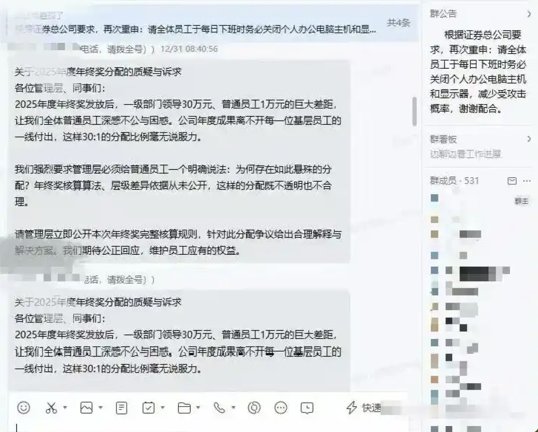 基于此,2025年12月31日当天,他在工作群发出相关质疑信息。