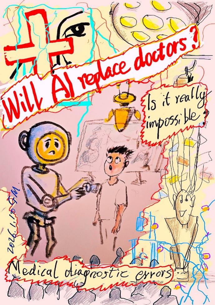图3 AI会取代医生吗? 纸本彩墨+手机手绘 李公明 作 2026年1月10日