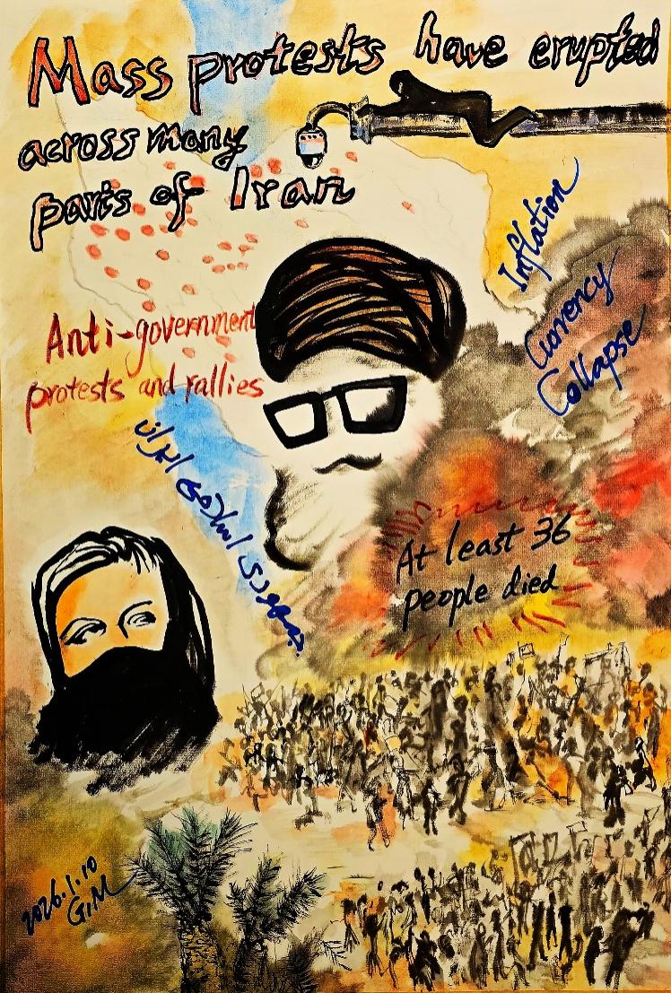 图1 伊朗全国多地爆发大规模抗议示威活动 纸本彩墨65cm X 45cm 李公明 作 2026年1月10日