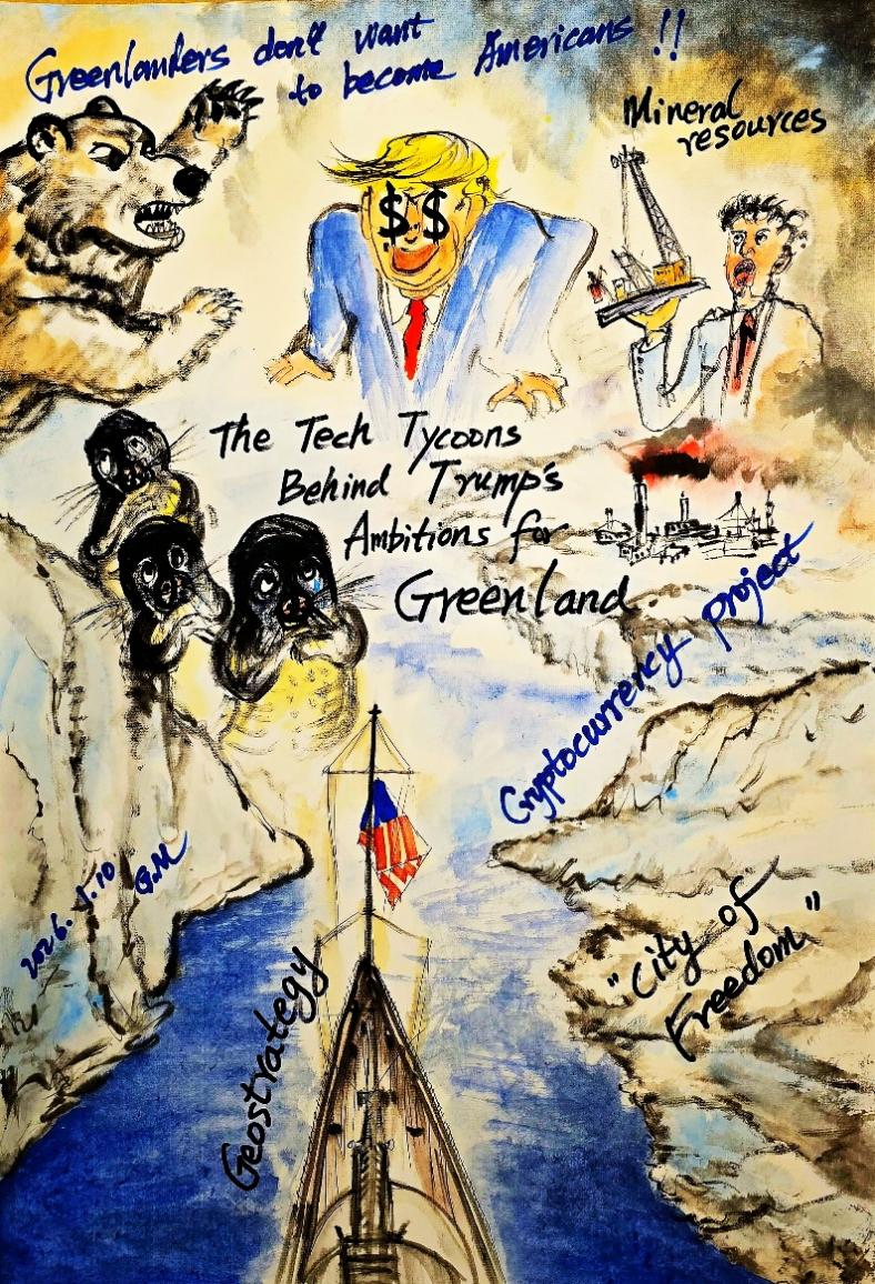 图2 在特朗普对格陵兰岛的野心背后的科技寡头 纸本彩墨65cm X 45cm 李公明 作 2026年1月10日