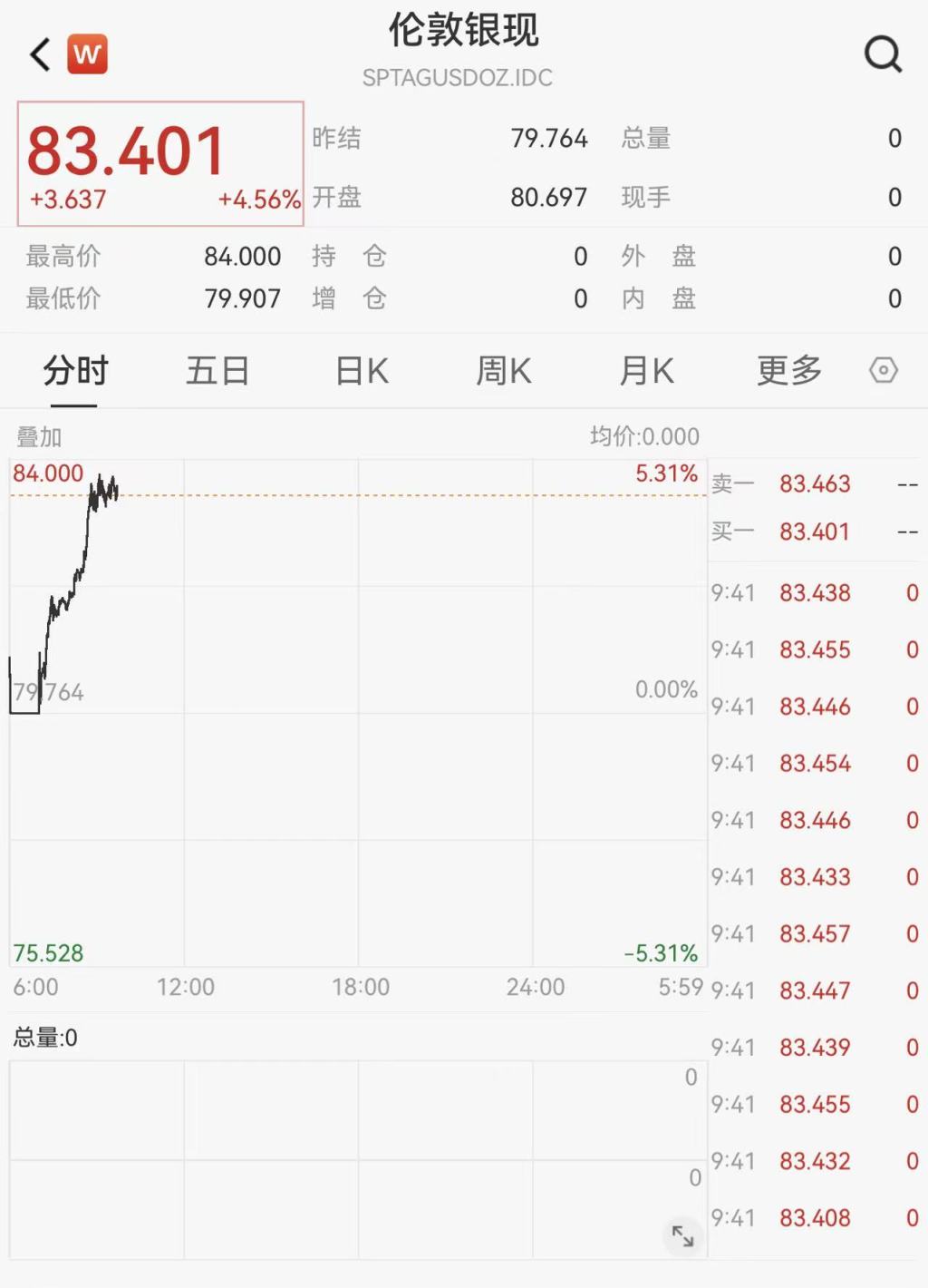 现货白银(伦敦银现)涨幅扩大至4.56%,最高价报84美元/盎司,创历史新高。截至发稿报83.401美元/盎司。