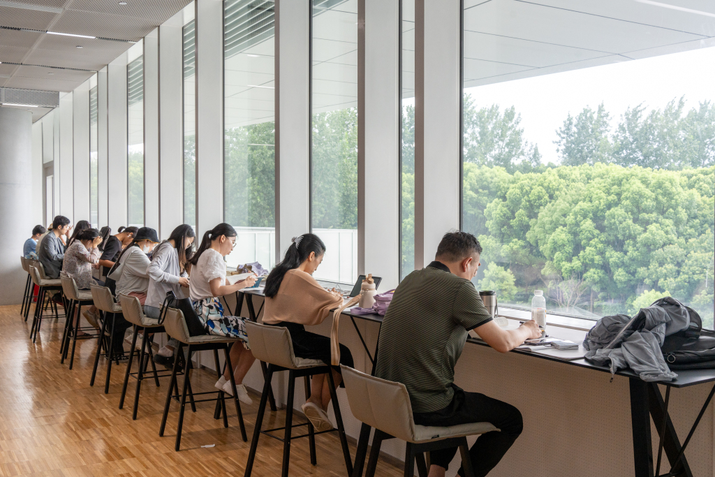 上海图书馆东馆面向窗外绿地阅读、自习的读者。