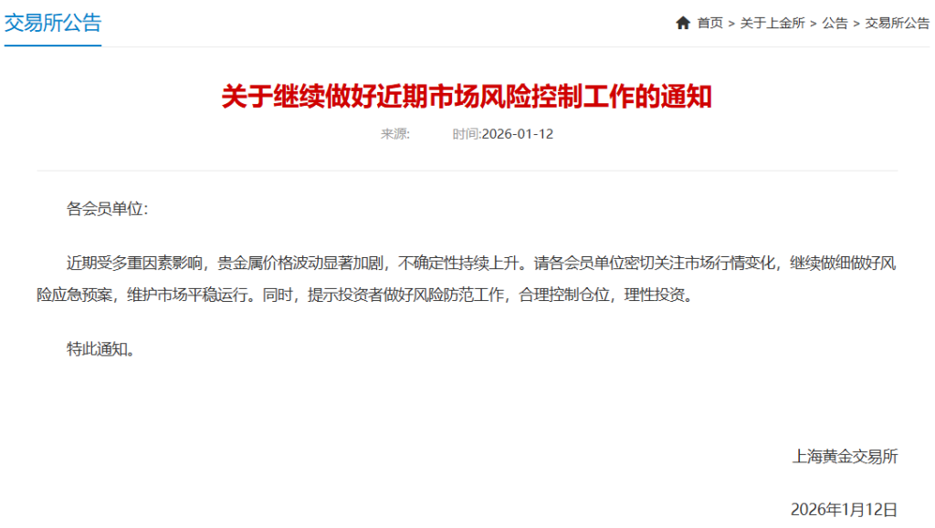 上交所在《关于继续做好近期市场风险控制工作的通知》中表示,近期受多重因素影响,贵金属价格波动显著加剧,不确定性持续上升。请各会员单位密切关注市场行情变化,继续做细做好风险应急预案,维护市场平稳运行。同时,提示投资者做好风险防范工作,合理控制仓位,理性投资。