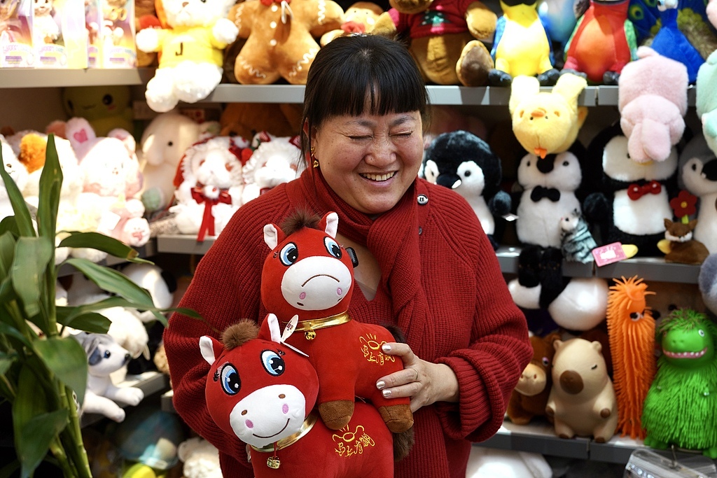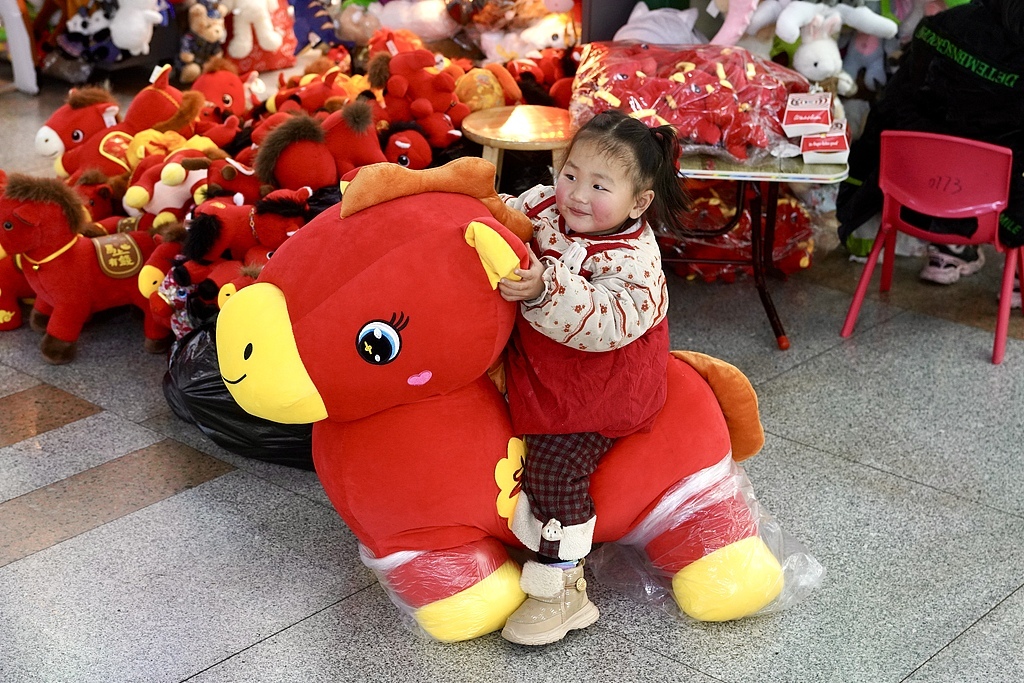 2026年1月11日,浙江义乌,一位小朋友在店门口“试驾”大号的马年毛绒玩具。 中新社记者 董易鑫 摄