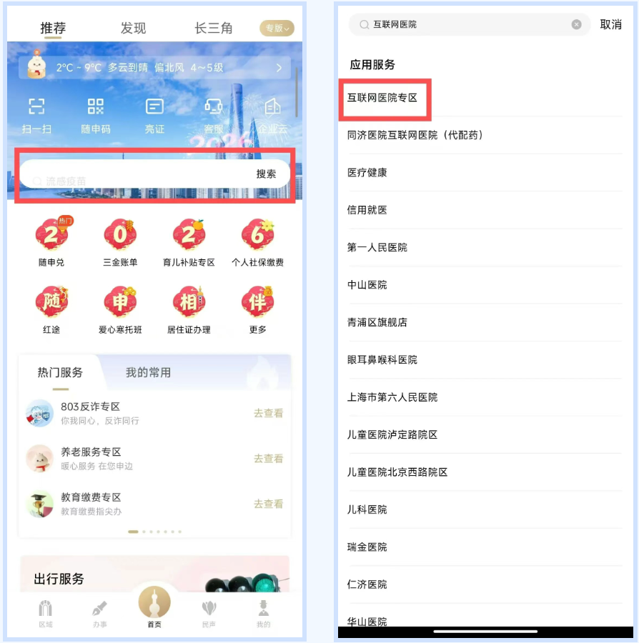 打开“随申办市民云”APP,首页搜索关键词“互联网医院”,点击即可进入对应服务。