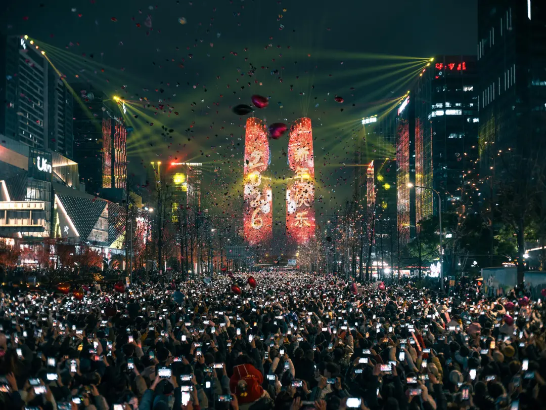 ▲2026年1月1日,市民在成都双子塔下观看跨年灯光秀 图据视觉中国