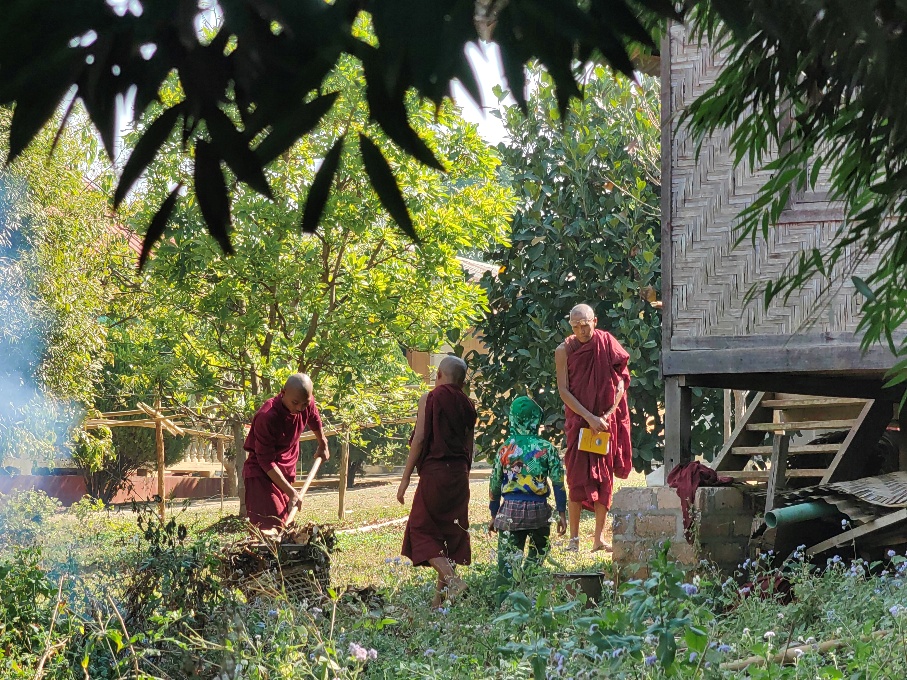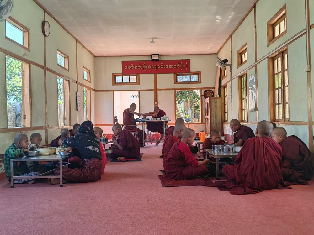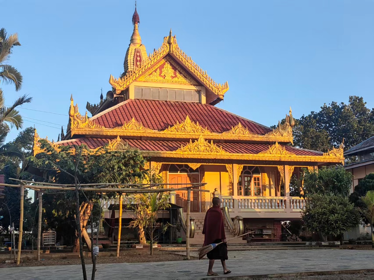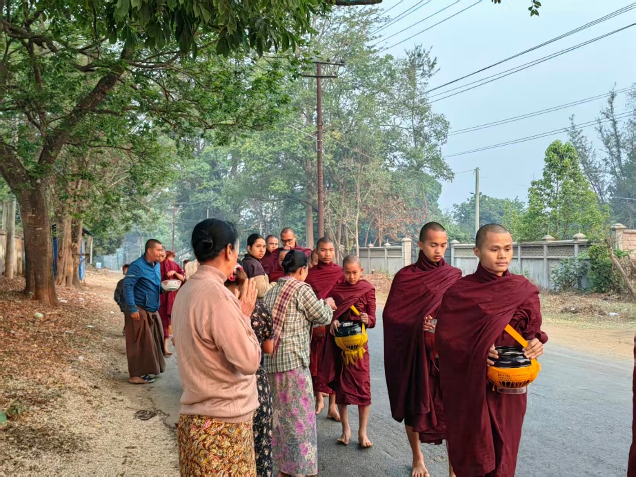 2024年初,我以中文志愿者的身份进入缅甸曼德勒彬乌伦的一个寺院进行为期近四个月的田野调查。基于缅甸人对佛教的虔诚信仰,僧人备受尊崇,寺院也是缅甸最为安全的落脚地。此前,我已通过线上的形式教授寺院沙弥中文半年,得知我要线下来缅甸教授他们中文同时调研佛教相关的事情,他们都非常热切地欢迎我的到来。在出发前的前几个月,我总是焦虑地反复询问我到那边住宿饮食怎么安排,我需要提前携带什么购买什么,他们总是非常平和地告诉我不需要担心,一切都由他们安排。半年的线上接触,让我对寺院的两位长老和年轻比丘们都有一定了解,我尝试克服自己的焦虑情绪,信任他们真的能为我安排好一切,同时也做好了在一个糟糕的外部环境里艰难度过四个月的心理准备,毕竟这是处于战乱与贫穷之中的缅甸。但当我抵达缅甸,我才真的意识到“一切由我们安排”是一句切实真挚的承诺。寺院将一座供给居士居住的小院腾出来给我居住,这座小院是一个七八十平的平房,一室一厅一卫,马桶洗衣机电饭锅电磁炉等基本家具一应俱全,很多都是新购入的。1月的彬乌伦昼夜温差大,夜里总有些寒冷,他们为我准备了几床厚棉被。长老还担心准备得不够充足,在我抵达第二天委托几位在家众带我去集市购买其他我需要的物品。饮食方面,我和各位来寺院的在家众在每日早上和中午僧人们用餐完毕后一起享用僧人们托钵来的丰盛食物,僧人严格执行过午不食,但每日都会给我留足晚上需要的食物。担心我吃托钵食物太久不喜欢,他们也会不时让在家众制作各种缅甸美食或是购买中国美食带给我,甚至在中国新年里,委托在家众制作了饺子和麻辣香锅帮我庆祝中国新年。后来我了解到,缅甸的一个习俗是,对于远道而来的客人,缅甸人会倾注大量的财力和心血保证客人得到最好的照顾。我到缅甸的当晚,两位长老告诉我,以后这里是你在缅甸的家,我们是你在缅甸的亲人。四个月的相处,他们确实待我如亲人,我收获了二十斤的体重增长和沉甸甸的关爱。后来每每有人问起,我为什么这么勇敢去缅甸调研,我总是一笑:“勇敢其实是一种信任。”