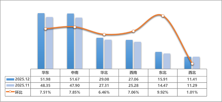 2025年12月,全国二手车市场整体交易量呈现出积极向好的回暖态势。从六大区市场表现来看,东北地区的表现尤为亮眼,环比增速接近10%;与此同时,其余五个区域交易量也均实现了不同幅度增长。