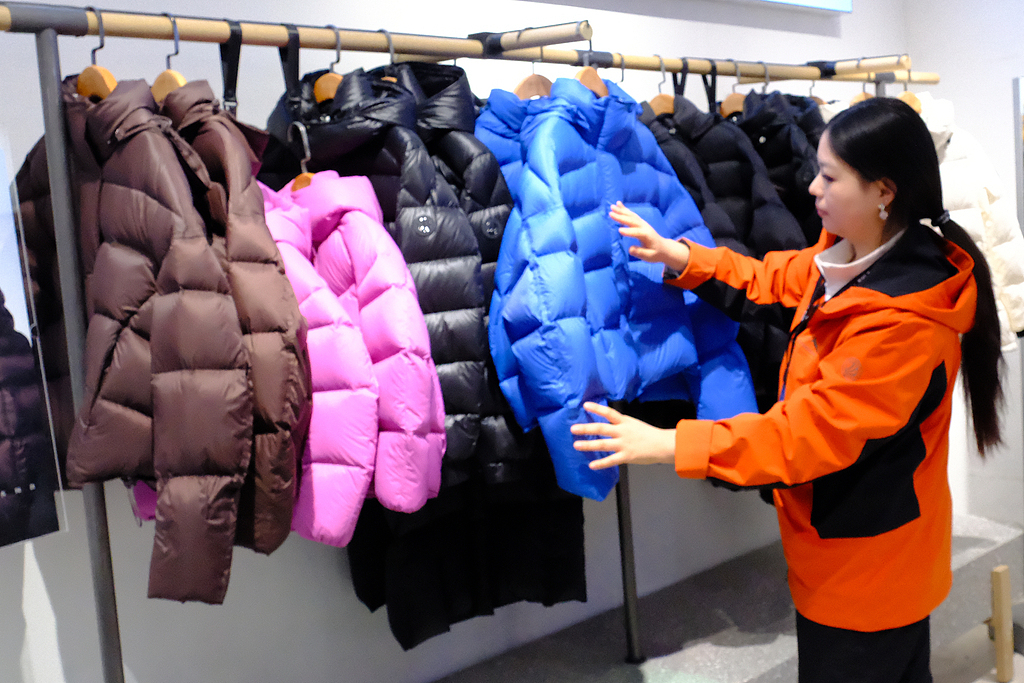 2025年11月28日,顾客在江苏省苏州市第23届“一百羽博会”展销现场选购琳琅满目的新款羽绒服饰。视觉中国 资料图