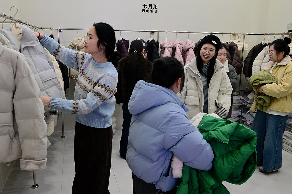 2025年12月28日,浙江嘉兴,客商在平湖市“平湖·中国服装城”的一家商铺内洽谈、选购羽绒服。视觉中国 资料图