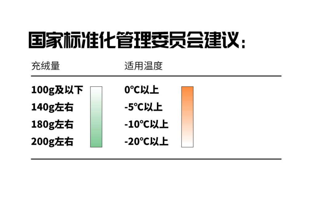 根据国家标准化管理委员会的建议,充绒量100g及以下的羽绒服通常适用于0℃以上的温度穿着,充绒量140g左右的羽绒服通常适用于-5℃以上的温度穿着,充绒量180g左右的羽绒服通常适用于-10℃以上的温度穿着,充绒量200g左右的羽绒服通常适用于-20℃以上的温度穿着,另外,羽绒服的保暖性还与面料防风性、服装款式、长短等有关,具体需根据成衣保暖性测试结果确定羽绒服适合穿着的温度。