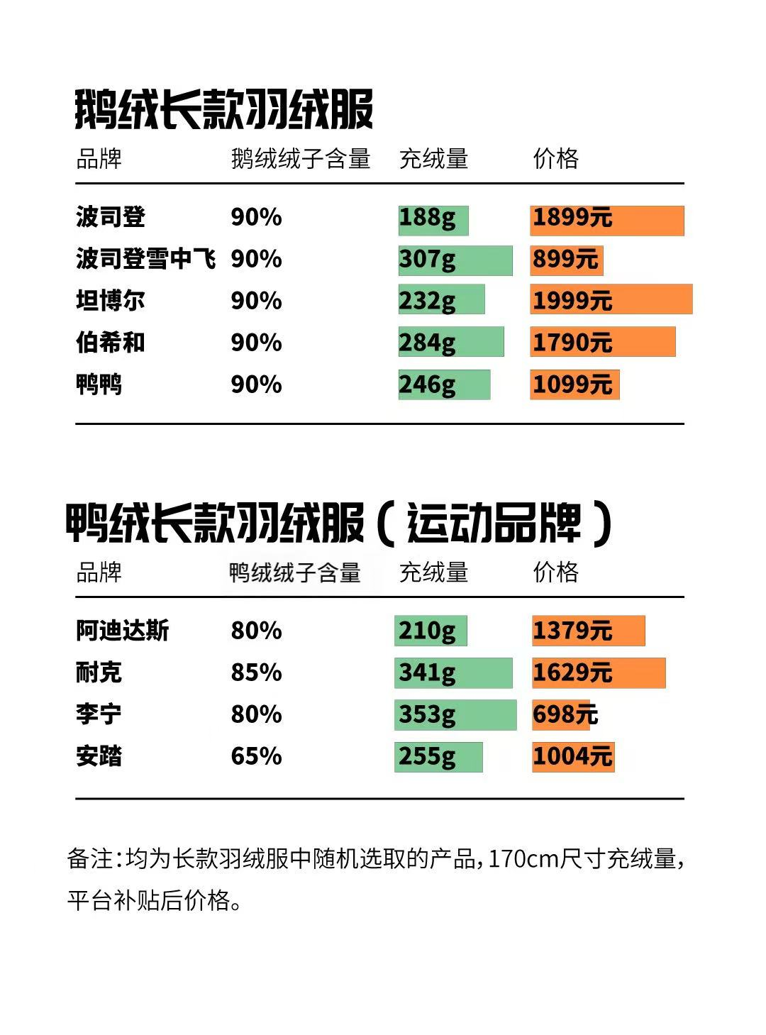 而运动品牌的鸭绒长款羽绒服产品方面,阿迪达斯一款长款面包服羽绒服,鸭绒绒子含量为80%,充绒量210g,价格为1379元;耐克一款新款长款羽绒服,鸭绒绒子含量为85%,充绒量341g,价格为1629元;李宁一款长款羽绒服,鸭绒绒子含量为80%,充绒量353g,价格为698元;安踏一款长款运动羽绒服,鸭绒绒子含量为65%,充绒量255g,价格为1004元。