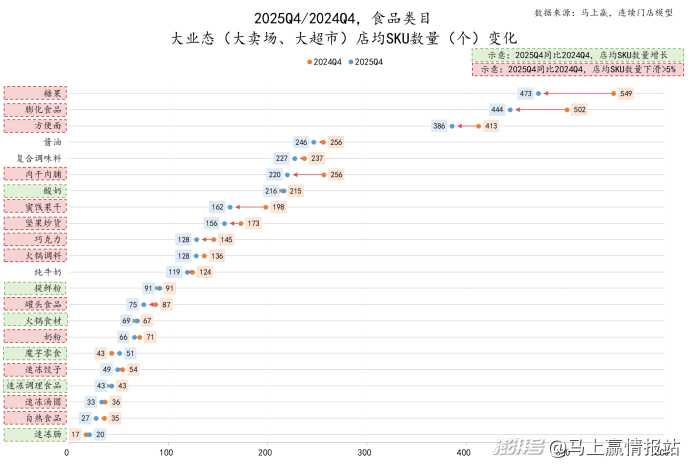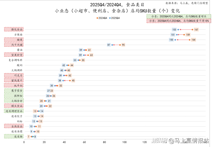 在下面的组图中,类目文字上有绿色虚线方框意为该类目在该业态类型中的店均SKU数量同比有所增长,没有背景色块的、红色虚线方框的类目则是店均SKU数量同比有所减少,其中红色虚线方框为2025Q4同比2024Q4,店均SKU数量同比下降超过5%的类目,敬请知悉。