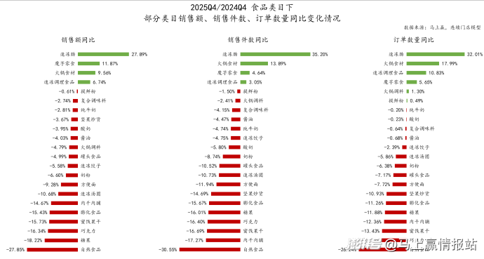 在2025Q4,食品类目中,销售额、销售件数与订单数量同比均为增长的类目为速冻肠、魔芋零食、火锅食材、速冻调理食品。在上文占比部分中,我们也详细讲了几个类目的情况,在今年冻品新兴品类几乎可以说是支撑起了整个食品品类线下传统零售渠道中的增长,尤其是速冻肠,销售额同比增速接近30%,增长势能相当强劲。