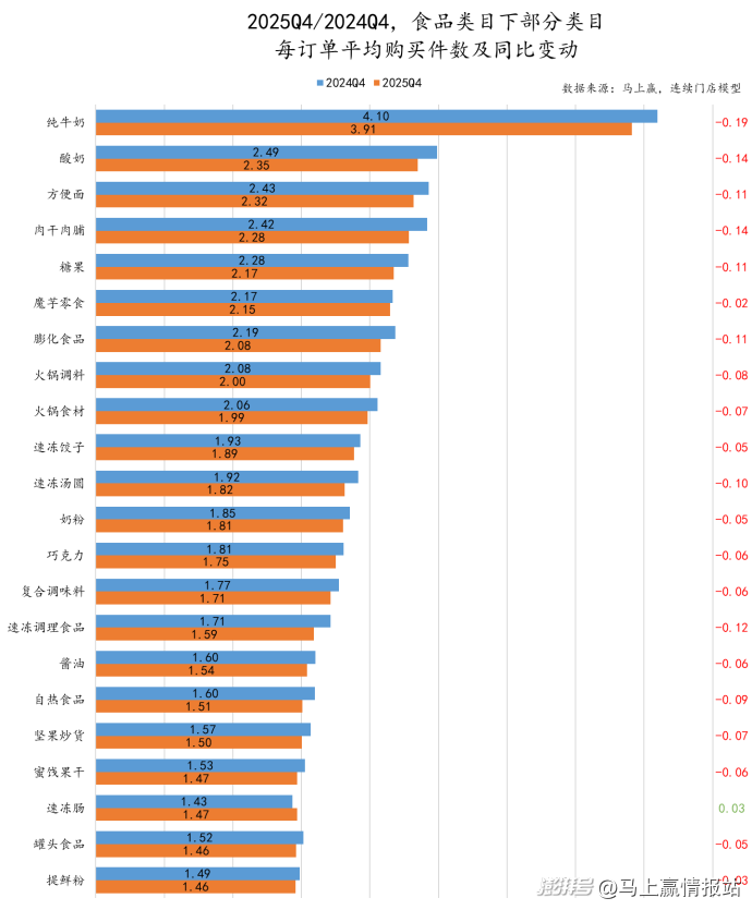 在2025Q4,食品类类目每订单平均购买件数变动上,仅有速冻肠类目有着极小幅度的同比增长,这也与类目本身的快速成长相关。
