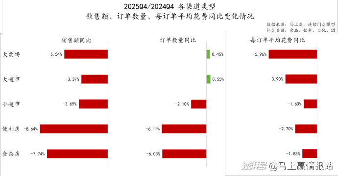 为尽可能准确呈现线下零售趋势,剔除门店数量变动所带来的影响,本次季度复盘以马上赢【连续门店模型】样本集数据为基础,即样本集均为截至2025年12月,连续在网超过15个月及以上的门店,2024Q4/2025Q4样本规模一致。需要特别说明的是,该数据集可能与此前马上赢情报站常用的MSY150均衡模型、全量门店模型等业态构成不完全相同,数据细节及趋势可能有差异,详询马上赢了解各模型间的区别与使用方法。