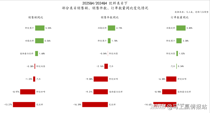 除此以外,植物蛋白饮料销售额同比增长但销售件数、订单数量同比显著下滑,或与产品涨价升级,或产品礼盒、组合等新产品销售组合形式变化相关;即饮奶茶、汽水基本保持稳定小幅度波动。