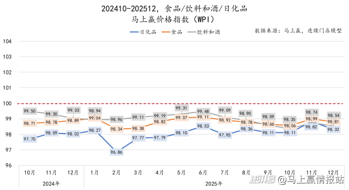 202410-202509过去五个季度以来,马上赢价格指数(WPI)中,食品、饮料和酒,以及日化品三大类目的价格指数总体均维持在100以下,价格压力依然较为明显。