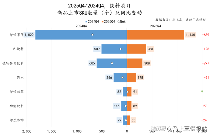 在2025Q4,饮料类目新品上市SKU数量及同比变动上,仅有即饮奶茶的新品SKU数量超过去年同期,或可说明今年品牌与厂商对于该类目信心较为充足,可以进一步观察即饮奶茶在今年冬天的表现。