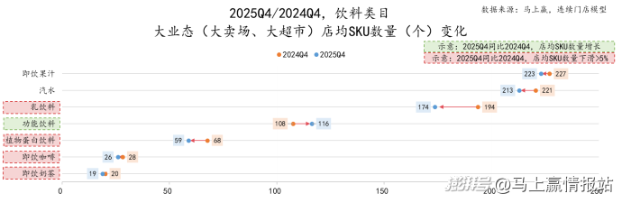 2025Q4,饮料类目各类目在大业态的店均SKU数量变化情况上,乳饮料、植物蛋白饮料均有着相对较大幅度的同比下滑,即饮咖啡、即饮奶茶则是在本身就不多的店均SKU数量上有着进一步的缩减。相比来说,仅有功能饮料有较明显的店均SKU数量提升。
