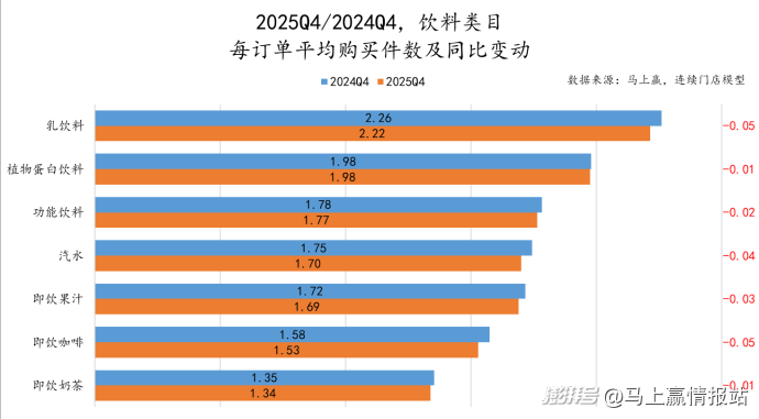 在2025Q4,饮料类类目每订单平均购买件数变动上,各类目的同比变化都不算大,波动集中在-0.1~0pcs/每订单平均之间,与食品类的描述类似,各类目整体都处于每订单平均购买件数下降的通道中,没有明显变动,但整体方向或许与线下零售发展以及消费者依然信心不足等因素相关。