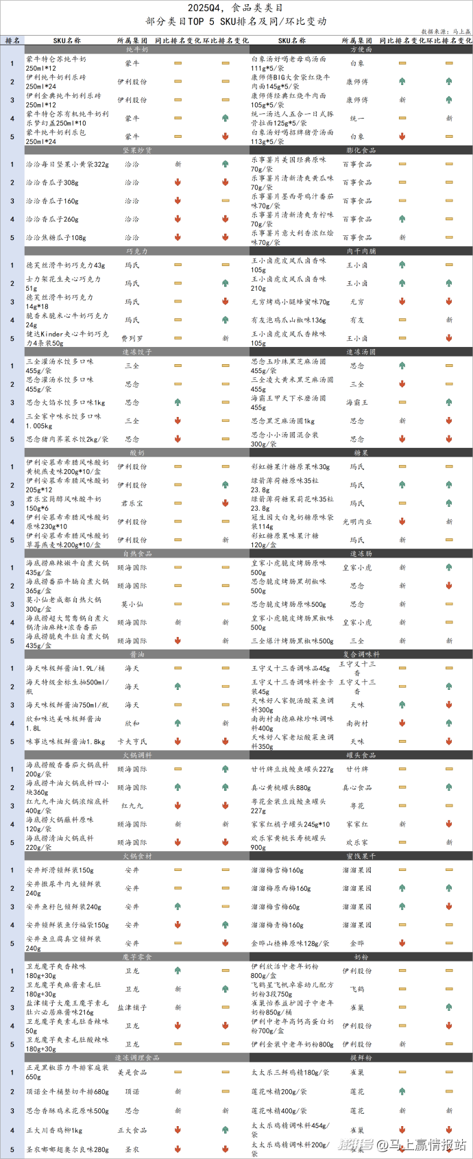 在以商品为核心的「货」相关的观察中,基于上述食品、饮料中的典型类目范围,我们拉取了这些类目在该季度的市场份额Top 5 SKU及与去年相比的排名变动情况,以及这些类目的新品上市数量变化。