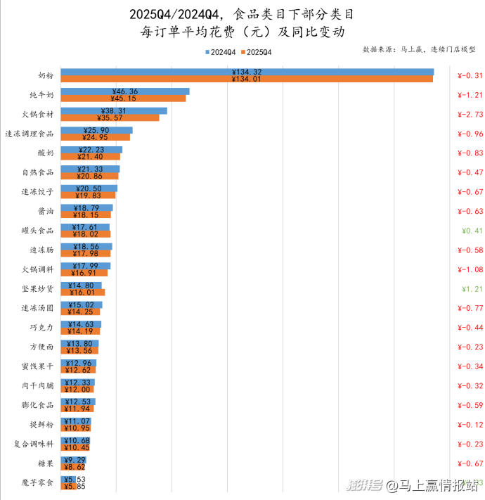 在2025年Q4,销售额、订单数量与订单平均花费三个指标的同比下滑幅度,都有着非常明显的收窄,这是一个可喜可贺的变化,但在这一结果背后,依然可能由积极、消极两种因素影响所致:从积极的角度看,随着经济周期的进一步推进与发展,在包括但不限于零售行业中,均看到了正在发生的企稳与筑底,销售额整体以及订单数量、订单平均花费下滑的收窄或是这一社会经济趋势的具象化展现;从消极的角度看,自2024年初马上赢情报站开始推出线下零售速报栏目以来,大多数季度的三个指标同比均呈现较明显下滑,在人口规模、经济活动情况整体稳定的背景下,剔除样本数量等客观影响后,这一指标也不可能无限制的下行。随着历史基数的不断调低,同比情况也理应逐年趋于稳定,甚至有所回升。