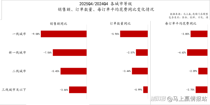 马上赢品牌CT的线下零售监测网络覆盖了全国县级以上各等级城市(不含乡、镇、村),并深度覆盖全国核心城市群。我们拉取了各城市等级的2025Q4相关数据,并进行同比情况的观察。