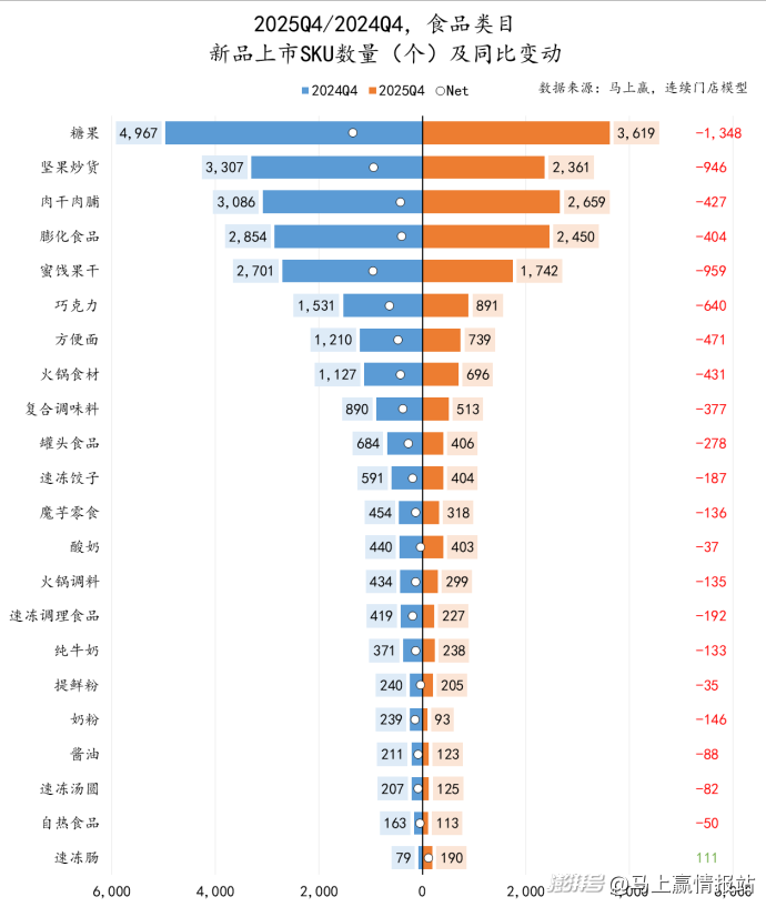 新品部分,我们将从各类目的新品上市数量及其同比变化角度,来观察各类目的创新活跃情况与推新意愿。马上赢对于“新品”的定义为在该季度首次登录在马上赢线下零售监测网络中的新商品信息及条形码。