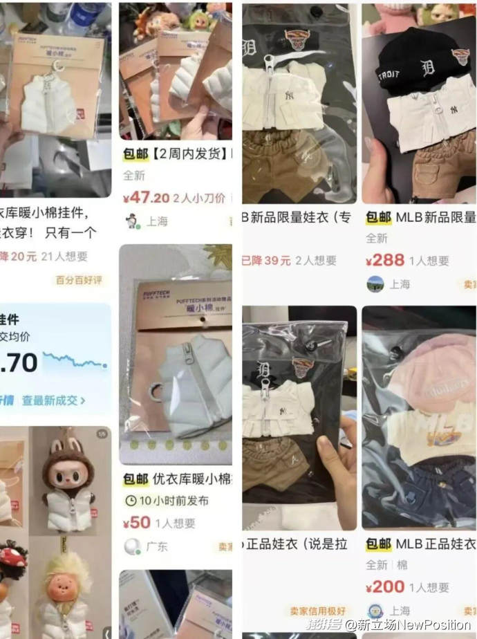 透视这场风潮,三类主要参与者正在重塑生态:其一,是以义乌供应链与独立设计师为代表的“草根创意军”,他们构成了丰富多元的供给基底;其二,是优衣库、MLB等传统服饰品牌,以“买衣服送娃衣”的营销巧思跨界切入,点燃大众市场的第一把火;其三,则是手握IP核心资产的行业巨头,如泡泡玛特、名创优品,他们正以截然不同的战略,谋划着娃衣生意的未来图景。
