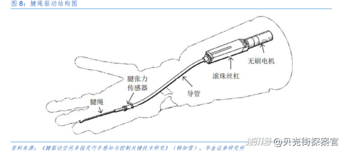 传动方式上,腱绳传动可实现远距离动力传递,灵巧手前臂中的电机通过齿轮箱驱动滚珠丝杠,通过滚珠丝杠上的螺母将旋转运动转化为直线运动,腱绳形成一个腱环套在螺母上,螺母拉动连接在灵巧手手指指骨上的腱绳,实现手指饶关节轴的转动运动。