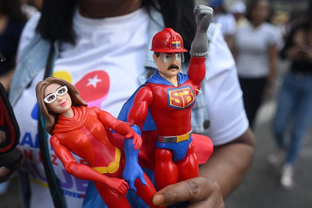 当地时间2026年1月6日,委内瑞拉加拉加斯,一名女子手持“超级大胡子”和“西丽塔”的披风超级英雄玩具,参加支持委内瑞拉总统尼古拉斯·马杜罗及其妻子西莉亚·弗洛雷斯的集会。视觉中国 图