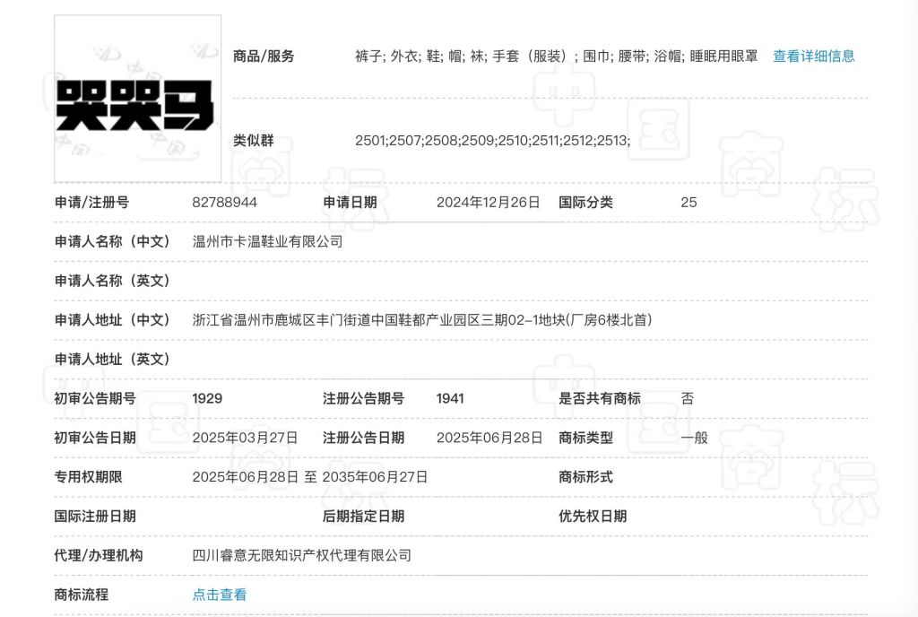 其实,相比专利申请的尴尬,“哭哭马”申请注册商标,或许是守住品牌的最佳手段。不过,查询中国商标网发现,“哭哭马”文字商标,目前已经由温州市一家鞋业公司在第25类裤子、外衣、鞋帽手套等商品上注册。这家公司最早在2024年12月就已经申请,2025年6月28日获得注册。