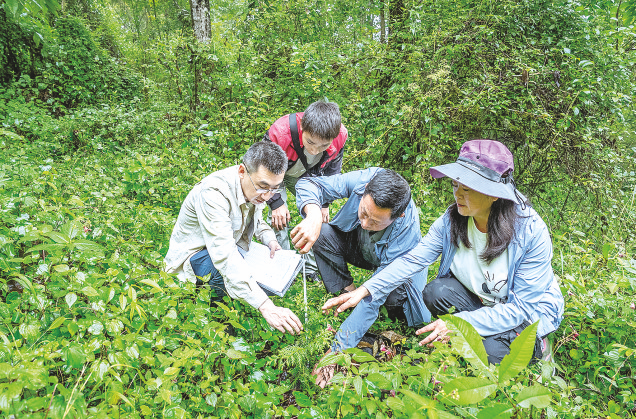 科研人员记录崖柏移栽后的生长情况。