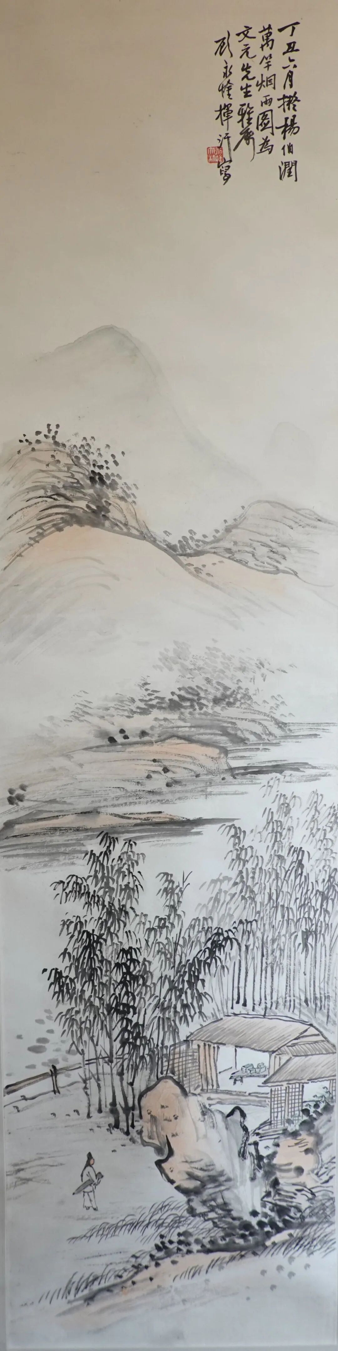 顾永惍《携琴访友》立轴 款识:丁丑六月临杨伯润万竿烟雨图为文元先生雅属,顾永惍挥汗写 钤印:永惍大利