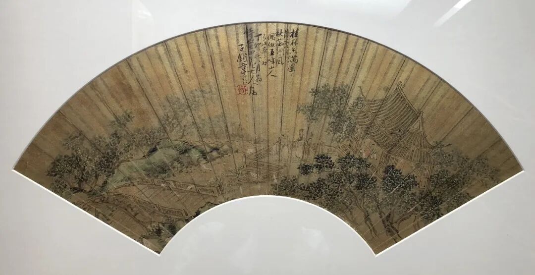 展出的清代钱杜《霓裳琴影》扇面,款识:“桂香蟾影秋无限,一曲霓裳万古情。道光壬午菊月,叔美钱杜。”
