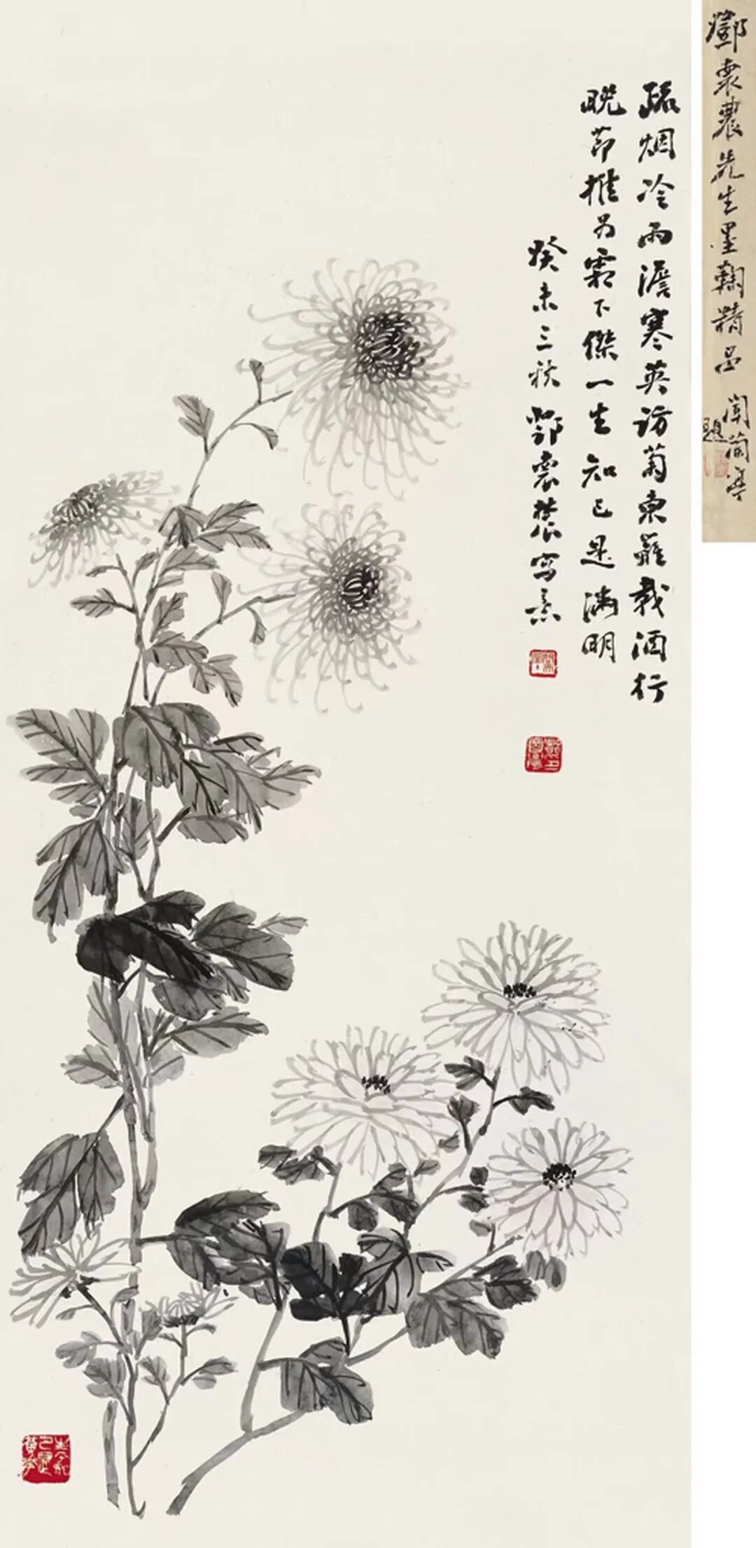 邓怀农《墨菊图》(民国旧裱闻兰亭题签)款识:疏烟冷雨澹寒英,访菊东篱载酒行,晚节推为霜下杰,一生知己是渊明。癸未三秋,邓怀农写意。 钤印:问天室主,邓怀农印,生平知己是黄花