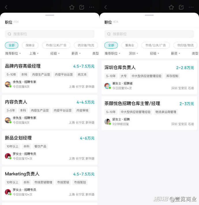 近日,BOSS直聘信息显示,茶颜悦色正在上海、深圳开启岗位招聘。在上海,茶颜悦色以4.5万~7.5万元的月薪招聘Marketing(市场)负责人,4.5万~7.5万元的月薪招聘品牌内容高级经理;在深圳,茶颜悦色以2万~3万元的月薪招聘仓库主管与经理、2万~2.8万的月薪招聘仓库负责人。