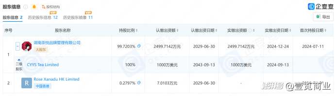 同年7月,湖南茶悦文化新增湖南茶悦品牌管理有限公司为股东,该公司法定代表人为茶颜悦色创始人吕良,注册资本1000万美元,由注册于香港的CYYS Tea Limited全资持股。