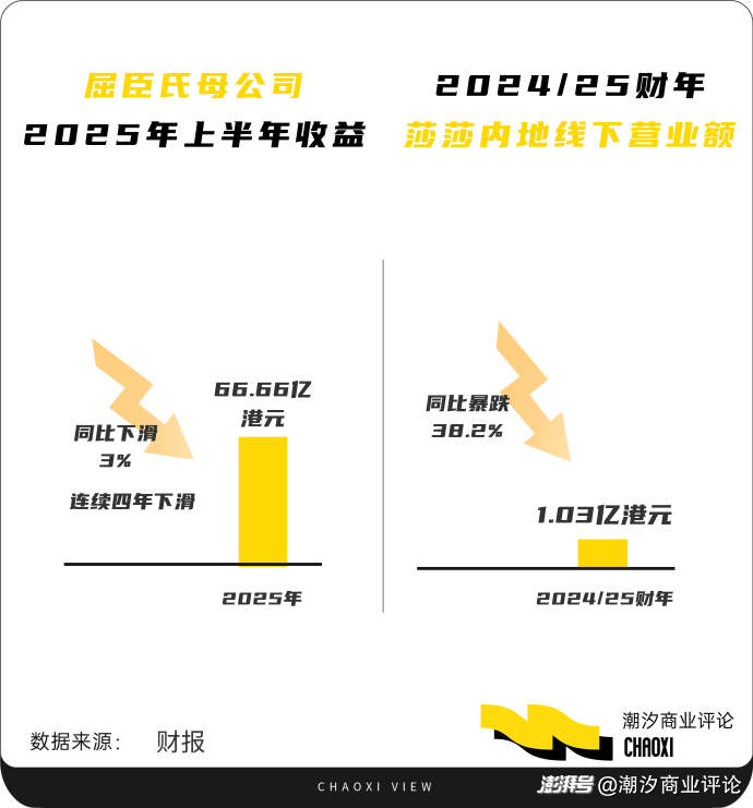 莎莎国际的撤退则更为彻底。2025年6月30日前,莎莎关闭了在中国内地的所有线下门店,结束了长达二十年的实体零售业务。数据显示,2024/25财年,莎莎内地线下渠道营业额同比暴跌38.2%,仅1.03亿港元,集团整体盈利也大幅下滑64.8%。