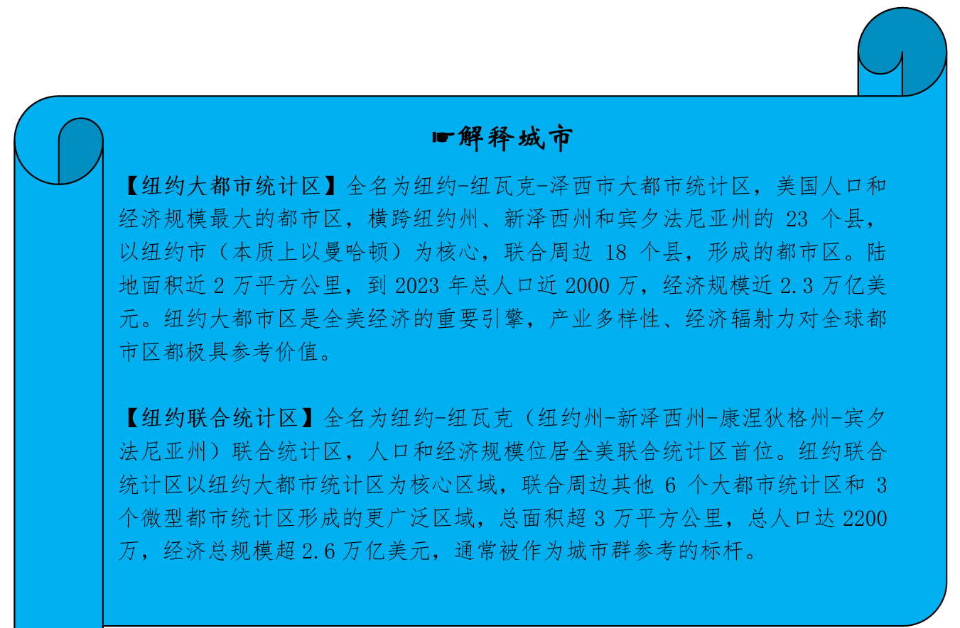 想要知道纽约市的辐射范围有多广,必须了解包含纽约的几个概念,一个是纽约州,美国50个州之一,经济总量50个州排名第3,2024年GDP总量大概2.24万亿美元,仅次于加利福尼亚州和德克萨斯州,如果按照经济体来计算,大约可以排到全球第9位,与意大利的GDP相差无几。纽约市是纽约州的最大城市(但并不是州府,纽约州的州府在奥尔巴尼)。有两个纽约都市区一直备受关注,也是上海大都市圈等国内一众都市区(圈)和城市群对标的重要样本。