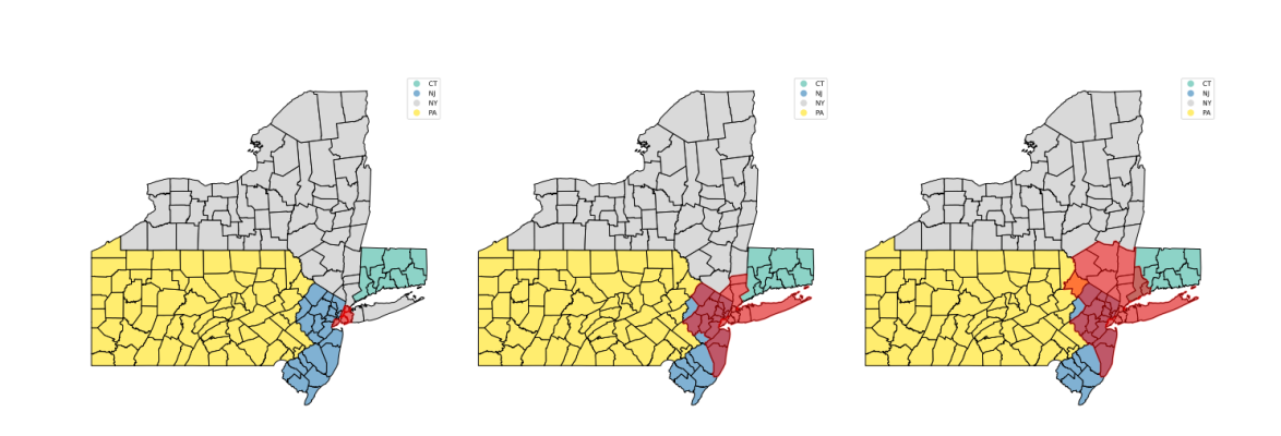 图3 纽约市及其大都市区划分示意图,从左向右红色部分分别是纽约市、纽约大都市统计区、纽约联合统计区