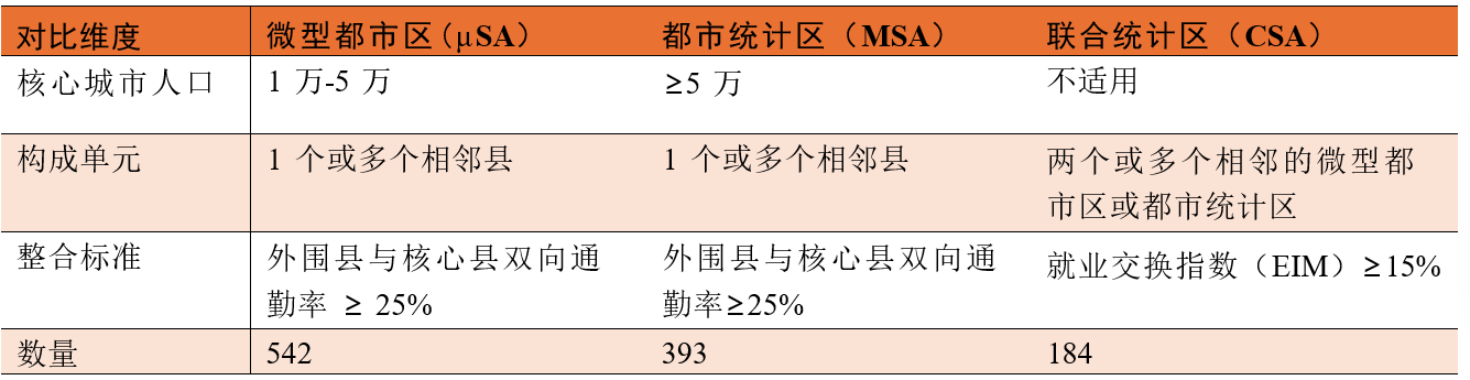 表3 美国核心统计区、都市统计区与联合统计区对比分析