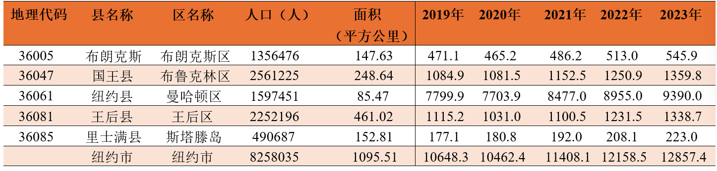 表2 纽约市各县2019-2023年GDP(单位:亿美元)