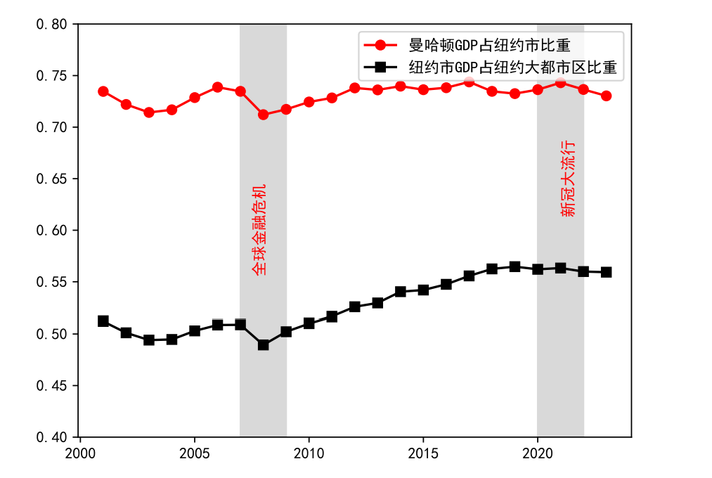 图1 2001-2023年曼哈顿占纽约市GDP比重和纽约市占纽约大都市区GDP比重变化图