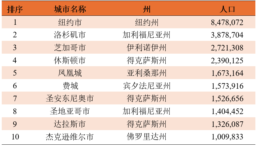 表1 截至2024年7月美国人口最多的10座城市