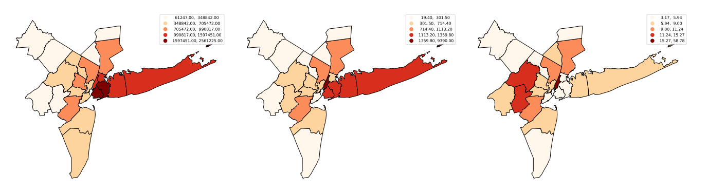 图2 纽约大都市统计区各县人口、GDP及人均GDP分布图