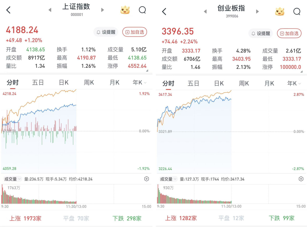至午间收盘,上证综指涨1.2%,报4188.24点;科创50指数涨3.71%,报1524.03点;深证成指涨1.98%,报14449.57点;创业板指涨2.24%,报3396.35点。