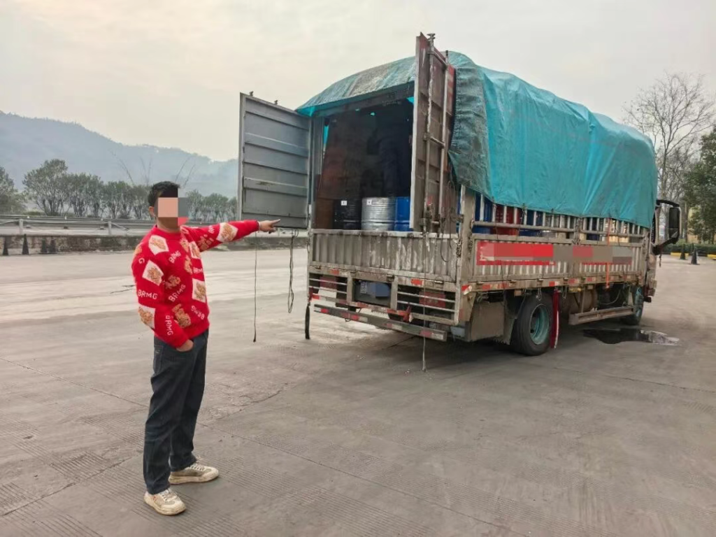 民警当即把存疑车辆引导至复查区,打开货箱继续检查发现有油桶装载的不明液体,油桶没有标签。民警应用检查设备检测,发现桶内疑似有可制毒危险化学品乙酸乙酯和二甲苯成分。面对事实,货运司机计某斌承认是经第三方介绍,在四川眉山非正常渠道获得的不明物品,交由其转运云南昆明。由于运费高于普通货物,计某斌欣然接单,不料到达云富公安检查站时被查获。