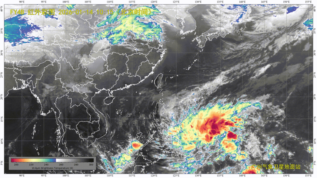 菲律宾以东洋面热带扰动已于今天(1月14日)上午加强为热带低压,08时其中心位于菲律宾马尼拉东偏南方向约1240公里,就是北纬9.4度、东经131.1度,中心附近最大风力有7级(15米/秒),中心最低气压为1002百帕。